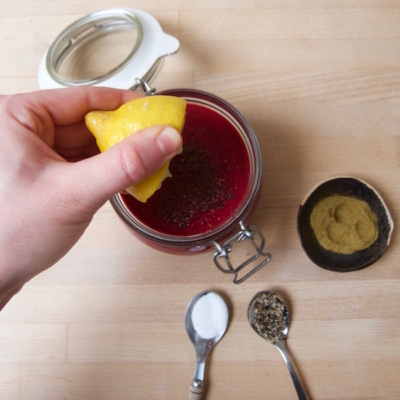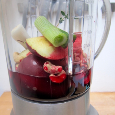 2Äpfel, Frühlingszwiebel, Cashewkerne und Rote Rüben Saft zusammen mit zwei Zweigen Thymian in einen Standmixer geben und cremig mixen bis keine Stücke mehr zu sehen sind.
