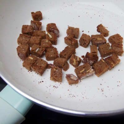 6Brotscheibe in Würfel schneiden und diese in einer Pfanne ohne Öl einige Minuten knusprig rösten. Thymianblättchen von den Zweigen abzupfen.