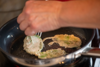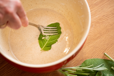 4Die Salbeiblätter in den Teig tauchen und in Sonnenblumenöl knusprig heraus braten.