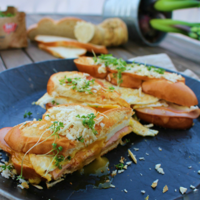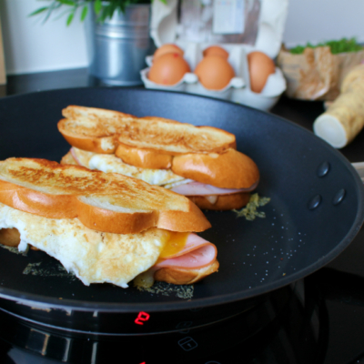 Ich weiß ja nicht wie das bei euch daheim so ist, aber bei mir bleiben zu Ostern immer die ein paar Restln von den Klassikern wie Brioche, Schinken, Käse und Kren über. Deshalb musste ein Rezept her, das sich dieser Reste annimmt. Kampf gegen Foodwaste – ist das Motto! Was passt da besser als ein in der Pfanne gebratenes knuspriges Brioche-Sandwich mit Spiegelei, Schinken und geschmolzenem Käse?