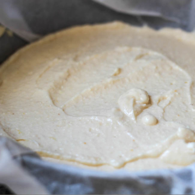 4Den Teig in eine mit Backpapier ausgelegte Springform streichen und mit den Erdbeerscheiben belegen.