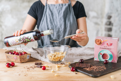 1Für die Schokowürfel die Bio-Dinkelwürfel mit dem Bio-Weichselsirup, Bio-Mandeldrink und Trinkkakao vermengen, beiseite stellen zum Einweichen.