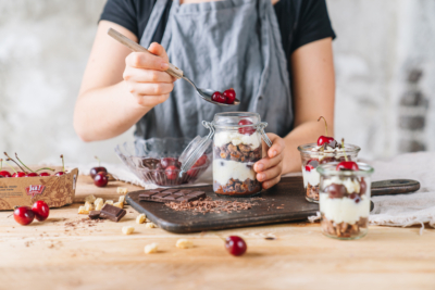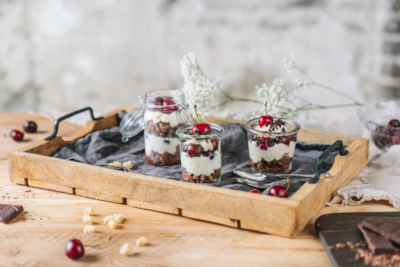 4Beginne in einem Glas deiner Wahl mit der ersten Schicht Bio-Dinkelwürfel, darauf folgt eine Schicht Creme und Kirschen, darauf wieder Bio-Dinkelwürfel, Creme und Kirschen. Je nach Höhe des Glases, kannst du beliebig viele Schichten auffüllen.