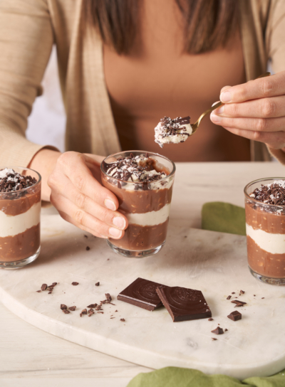 3Kokos- und Schokomasse abwechselnd in Gläser schichten und kühl stellen.
