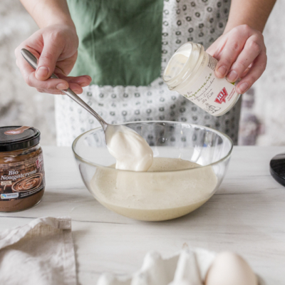 Nein, kein Scherz. Dieser Schokoladenkuchen verdankt seine besondere Saftigkeit der Mayonnaise im Teig. Bevor ihr jetzt angeekelt wegklickt: Mayonnaise besteht hauptsächlich aus Eiern und Öl. Beides ist nicht unüblich in Kuchen, oder? Ich habe mich selbst gewundert, als ich von der Verwendung von Mayonnaise in diversen Kuchenrezepten gelesen habe, aber die Idee hat mich neugierig gemacht: Funktioniert das wirklich? Merkt man überhaupt einen Unterschied? Und warum soll ich Mayonnaise verwenden, wenn ich auch Eier und Öl oder Butter nehmen könnte? Darum hab mich selbst an einer Schokokuchen-Variante mit Ja! Natürlich Mayonnaise versucht und das Team verkosten lassen. Das Ergebnis und natürlich das Rezept mit den besten Bio-Zutaten und palmölfreiem Nougatcreme-Topping findet ihr hier: