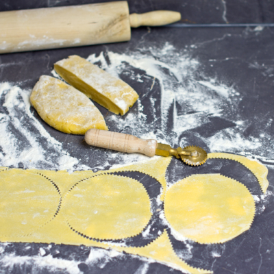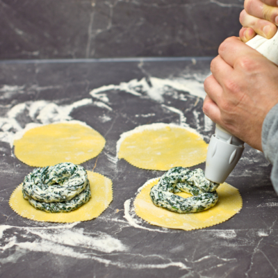 3Den Teig mit einer Pastamaschine oder einem Nudelwalker zu Teigbahnen ausrollen. Anschließend große Kreise ausschneiden (den 2. Kreis jeweils etwas größer ausschneiden).