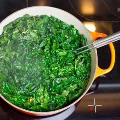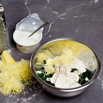2Für die Füllung den Schwarzkohl vom Strunk befreien, blanchieren und abschrecken. Den Schwarzkohl abtropfen lassen und mit den Händen das restliche Wasser so gut wie möglich ausdrücken. Nochmals kleinschneiden und mit dem Ziegentopfen, 100g geriebenen Käse, Salz und Pfeffer vermengen.