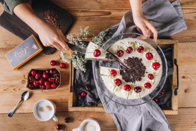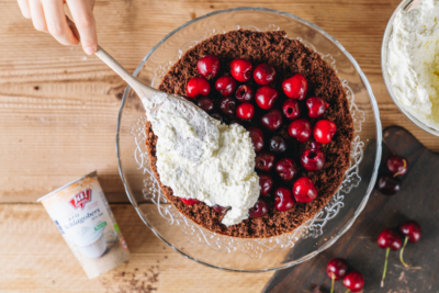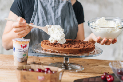 7Für die Dekoration die Bio-Schokolade grob hacken, den Tortenrand mit Creme-Tupfer verzieren, auf jeden Tupfer eine Kirsche setzen. Anschließend die gehackte Schokolade in der Mitte verteilen.