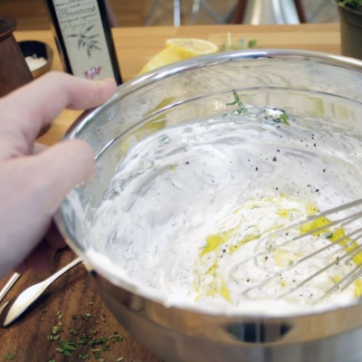 2Fein hacken. In einer Schüssel mit dem Ziegenkäse, Zitronenzeste und Olivenöl verrühren.