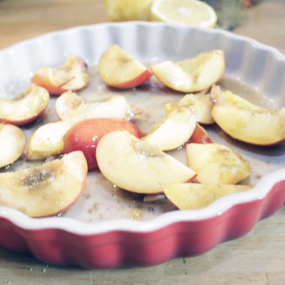 2In eine ofenfeste Form geben. In einer Schüssel Zucker, Zitronensaft, Orangenlikör und Vanillemark vermischen. Über die Nektarinen gießen, mit den Fingern die Früchte einreiben.