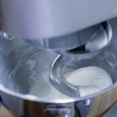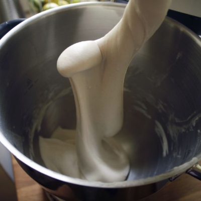 2Für den Hauptteig, den Poolish Teig mit Mehl und Wasser zirka 8 Minuten in der Küchenmaschine auf niedriger Stufe kneten. Diesen Teig 30min ruhen lassen (dieser Vorgang nennt sich Autolyse).