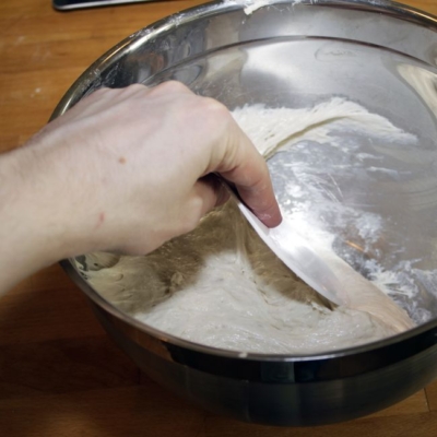 3Germ und Salz zum Hauptteig geben und für 10 Minuten auf mittlerer Stufe kneten. Der Teig ist fertig wenn er sehr elastisch ist und sich leicht von der Schüssel löst. Den Teig zudecken und für 2 Stunden bei Zimmertemperatur in einer rechteckigen Schüssel gehen lassen. Für eine bessere Brottextur, nach einer Tag den Teig kurz durchkneten.
