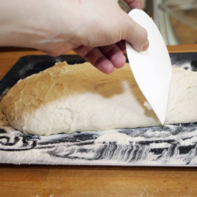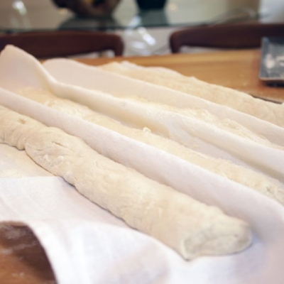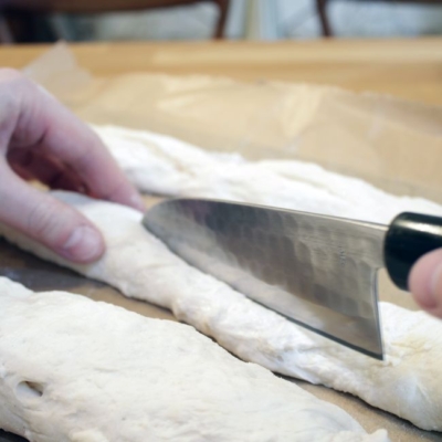 8Nachdem die Baguettes aufgegangen sind, sanft mit einer großen Holzschaufel auf ein Backblech mit Papier legen. Die Baguettes fest halten, mit einem scharfen Messer mehrmals längsweise einschneiden.
