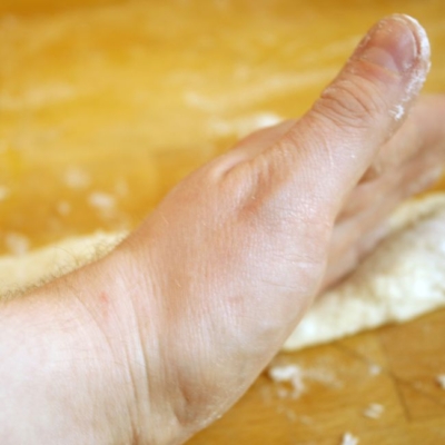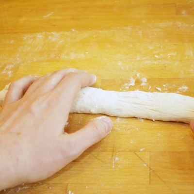 5Ein sauberes Geschirrtuch vorbereiten. Die Rechtecke umdrehen, die Seite die vorher am Boden war soll nach oben schauen. Den Teig hinten anziehen und wie einen Strudel nachvorne einschlagen. Eine Hand ausstrecken, mit dem Rücken des kleinen Fingers den eingeschlagen Teig festdrücken. Das Geschirrtuch mit ausreichend Mehl bestreuen, einen Teigling nach dem anderen einschlagen, zudecken und 30 Minuten aufgehen lassen.