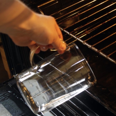 9In den Ofen schieben, Ofentür sofort schließen. Für die Dampfentwicklung das Glas mit Wasser nehmen, Ofentür schnell öffnen und Wasser ins tiefe Blech schütten, sofort die Ofentür wieder schließen damit der Dampf nicht entweichen kann. Baguette für 10 min anbacken. Danach Backofentür öffnen und den Dampf entweichen lassen, wieder schließen, Baguette bei 220°C für weitere 10 bis 20 Minuten fertig backen (je nach Größe). Die Baguettes sind durch wenn es sich beim Anklopfen hohl anhört, oder ein dünnes Messer ins Baguette stecken, es sollen keine Teigreste an der Klinge kleben.