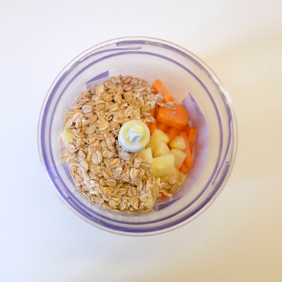 3Beides in eine Moulinette geben. Dinkelflocken und Öl dazu geben und sehr fein zerkleinern.