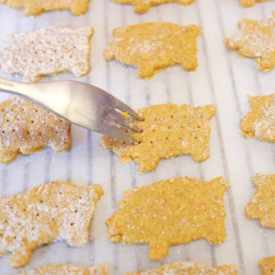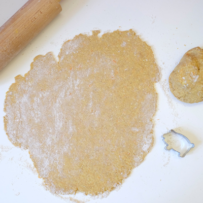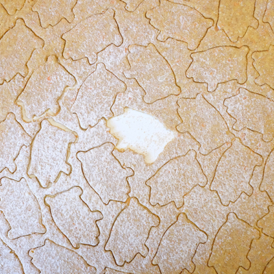 7Mit Hilfe eines Ausstechers kleine Kekse ausstechen und auf das Backpapier setzten. Tonis Tipp: Mit dem Schweinchenausstecher von Ja! Natürlich kommen die Hundekekse in die perfekte Form.