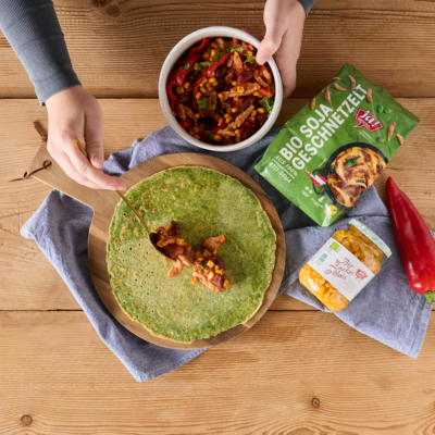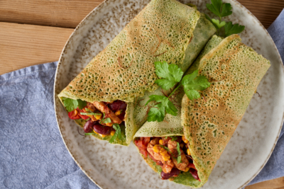 6Die Füllung auf die vorbereiteten Wraps verteilen und diese aufrollen. Die Spinat-Mais Tortilla Wraps nach Belieben mit frischen Bio-Kräutern garnieren.