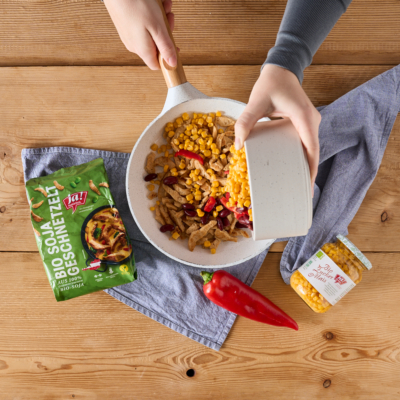 3Das Bio-Soja Geschnetzelte laut Verpackung in Wasser aufweichen. In einer weiteren Pfanne das Bio-Soja Geschnetzelte anbraten, bis es goldbraun ist.