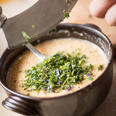 4Die zerkleinerten Kräuter zugeben, gut durchrühren und abschmecken.