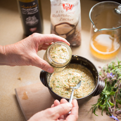 3Apfelsaft und Zucker zu den Senfkörnern geben und mit dem Mixstab pürieren (kürzer – der Senf wird grobkörnig, länger – der Senf wird feiner).