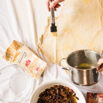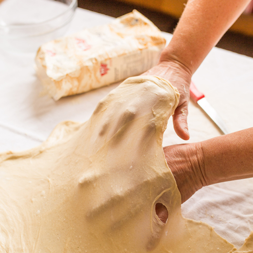 Beim Teig ausziehen die Ringe ablegen und mit zu langen Fingernägel, wird’s auch schwierig, dass der Teig nicht reißt. Wenn´s schnell gehen soll, kann man auch einen fertigen Ja! Natürlich Blätterteig verwenden.