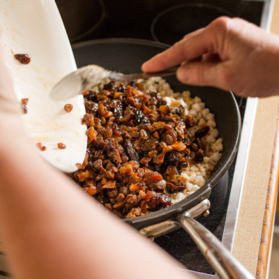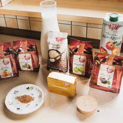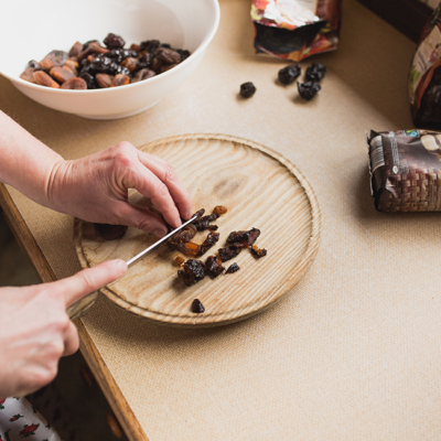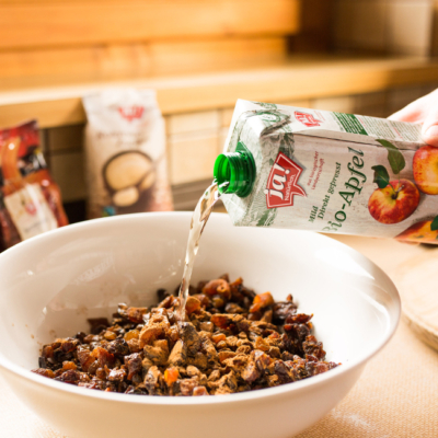 1Das Dörrobst klein schneiden und mit dem Lebkuchengewürz ins Apfelsaft-Rum-Gemisch geben und gut durchziehen lassen.