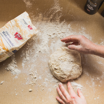 3Strudelteig zu einem weichen Teig zusammenrühren, seidig glatt kneten. Der Teig soll sich leicht vom Brett lösen.