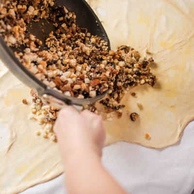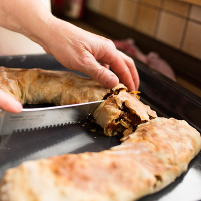 6Die geschnittenen Semmeln in der restlichen Butter schwenken und mit Nüssen und Dörrobst mischen. Auf dem Strudelteig verteilen, mit dem straffgezogenen Tuch aufrollen und goldgelb backen.