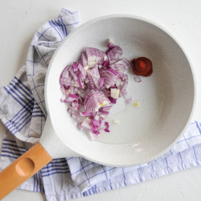 3Zwiebel fein würfeln und in Sonnenblumenöl glasig werden lassen