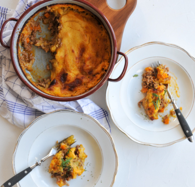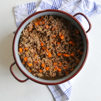 8In eine Ofenform erst das Fleisch geben und mit dem Püree abdecken