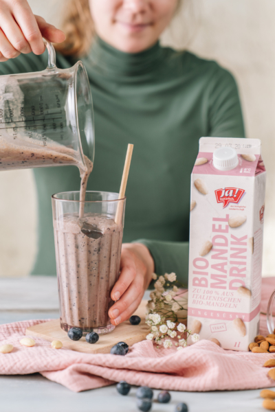 2Banane mit Heidelbeeren und dem Mandeldrink mit dem Stabmixer gut mixen.