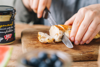 2In der Zwischenzeit das Bio-Wiesenhendl Filet leicht salzen und pfeffern, von beiden Seiten in einem möglichst neutralen Pflanzenöl anbraten - zur Seite stellen und abdecken.