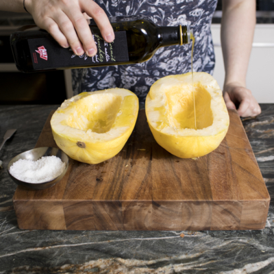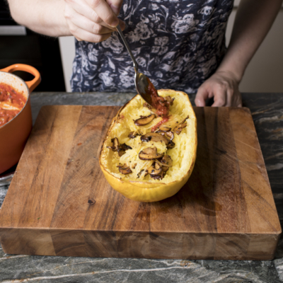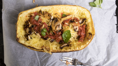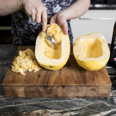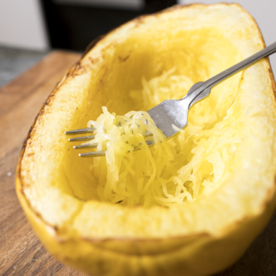 Der geschmorte Spaghettikürbis schmeckt auch kalt sehr gut. Er lässt sich auch zu Suppe weiterverarbeiten.