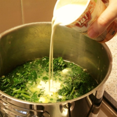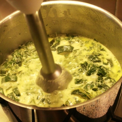 2Suppengemüse in einem halben Liter Wasser zu Suppe kochen. Salzen und pfeffern. Inzwischen den Spinat auftauen und in der Butter anschwitzen. Knoblauch dazu pressen. Nach 5 Minuten mit der Suppe angießen.