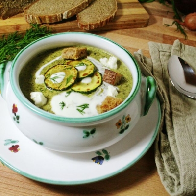 3Zucchinischeiben, Schlagobers, zwei Drittel vom Feta, Frischkäse und Muskat dazugeben. Einmal aufkochen und noch 5 Minuten köcheln lassen. Dann fein pürieren. Dill waschen und trockenschütteln. Etwas zum Garnieren beiseite legen; den Rest fein hacken und zur Suppe geben. Die Suppe mit Salz, Pfeffer und Zitronensaft abschmecken.
