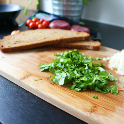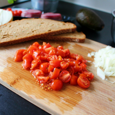 4Die Cocktailtomaten und die Gurken waschen und in feine Würfel schneiden.