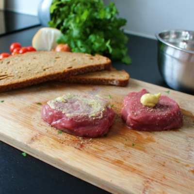 10Die Steaks in der Pfanne von beiden Seiten für ca. 2 Minuten anbraten. Anschließend in einer Alufolie mit der glänzenden Seite nach Innen einpacken und in den vorgeheizten Ofen legen.