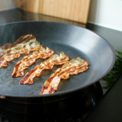 5Den Speck in einer Pfanne knusprig anbraten. Dazu einfach eine Pfanne erhitzen und den Speck hineinlegen und langsam von beiden Seiten durchbraten. Dann den Speck auf eine Küchenrolle legen zum Abtropfen.