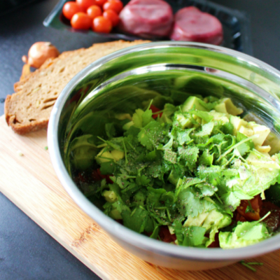 7Dann Avocado, Gurke und Cocktailtomaten in einer Schüssel vermischen.