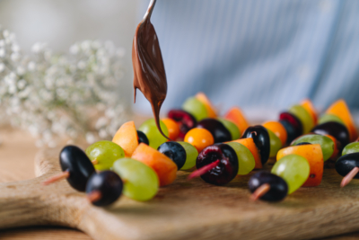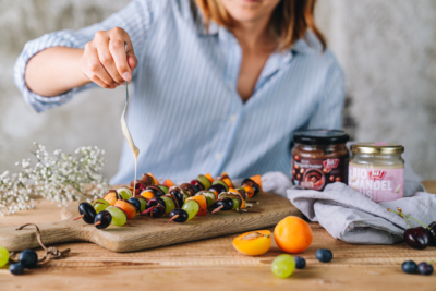 3Obst nacheinander auf Spieße geben und mit Bio-Mandelmus und Bio-Nougatcreme beträufeln.