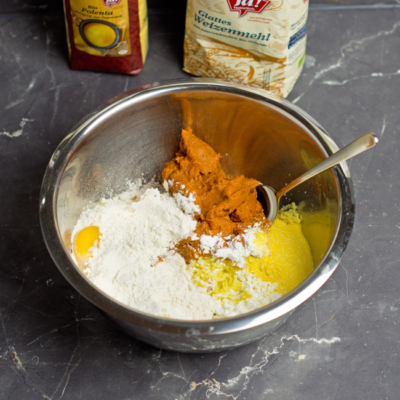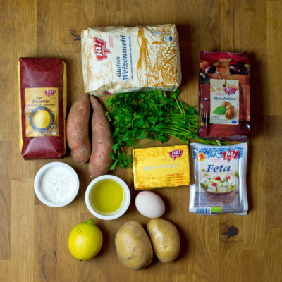 2Die geschälten Erdäpfel durch eine Presse drücken und die Süßkartoffeln fein pürieren. In einer Schlüssel die Erdäpfel und die Süßkartoffeln mit Stärke, Mehl, Polenta, Salz und dem Dotter zu einem Teig verarbeiten und für 30 Minuten ruhen lassen.
