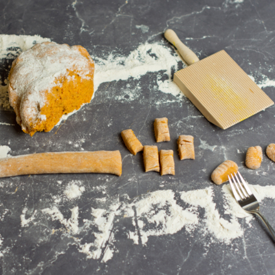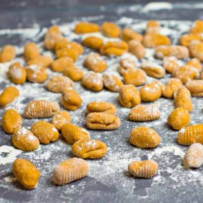 1Für die Gnocchi die Erdäpfel kochen bis sie gar sind und auskühlen lassen. Die Süßkartoffeln schälen, in Viertel schneiden, salzen und mit Olivenöl beträufeln. Auf einem Backblech verteilt, bei 180°C für ca. 20 Minuten im Ofen backen und ebenfalls auskühlen lassen.