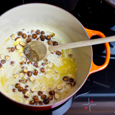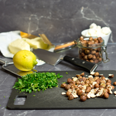 5Die Haselnüsse grob und die Petersilie fein hacken. In einer Pfanne die Butter erhitzen, die Haselnüsse darin anrösten, etwas Salz, Zitronenabrieb und ein paar Spritzer Zitronensaft hinzufügen.
