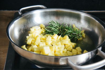 3Die Erdäpfel schälen und klein würfeln und mit den restlichen zwei Esslöffel Olivenöl und dem Rosmarin und Thymian kurz rösten, dann bei geschlossenem Deckel gar dünsten - das dauert etwa 10 Minuten. Von Zeit zu Zeit umrühren. Je kleiner die Würfel sind, desto schneller sind die Erdäpfel gar.