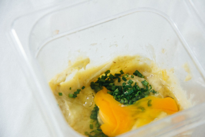 4Den gegarten Topinambur mit den gegarten Erdäpfel in eine Schüssel geben. Etwas überkühlen lassen. Mit dem Mixstab kurz durchmixen. Dann die zwei Eier und die Hälfte vom fein geschnittenen Schnittlauch zugeben und verrühren bis alles cremig ist.
