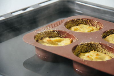6In ein tiefes Blech Wasser füllen. Die Muffinförmchen auf da Blech mit Wasser stellen und im Ofen bei 180 Grad Ober- Unterhitze etwa 40 Minuten backen.