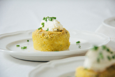 8Die Crème fraîche mit dem restlichen Schnittlauch und einer Prise Salz verrühren und mit dem lauwarmen Topinambur Flan servieren. Dazu passt auch warm geräucherter Fisch.