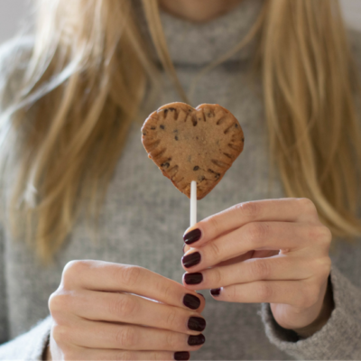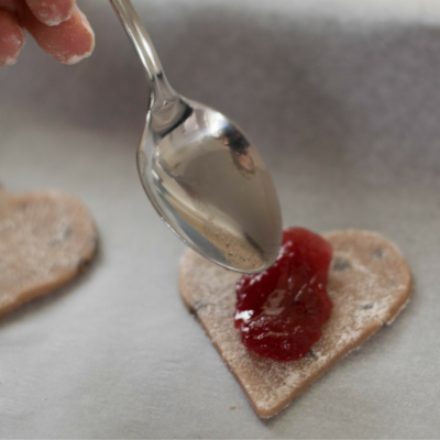 8Die Hälfte der Herzen mit einem Klecks Marmelade bestreichen. Danach die übrigen Herzen je auf ein Herz mit Marmelade legen.