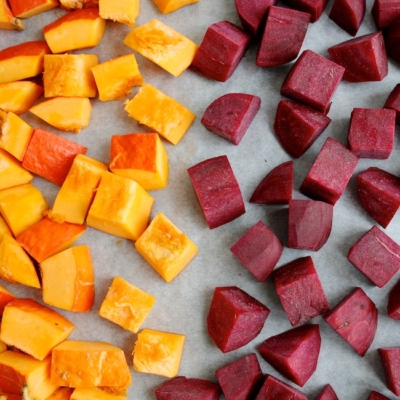 4Gemüsewürfel in einer Schüssel gleichmäßig mit der Marinade benetzen, salzen und großzügig auf einem Backblech verteilen, sodass genug Abstand zwischen den Würfeln bleibt. Ein überfülltes Blech lässt das Gemüse leicht „lätschert“ werden.